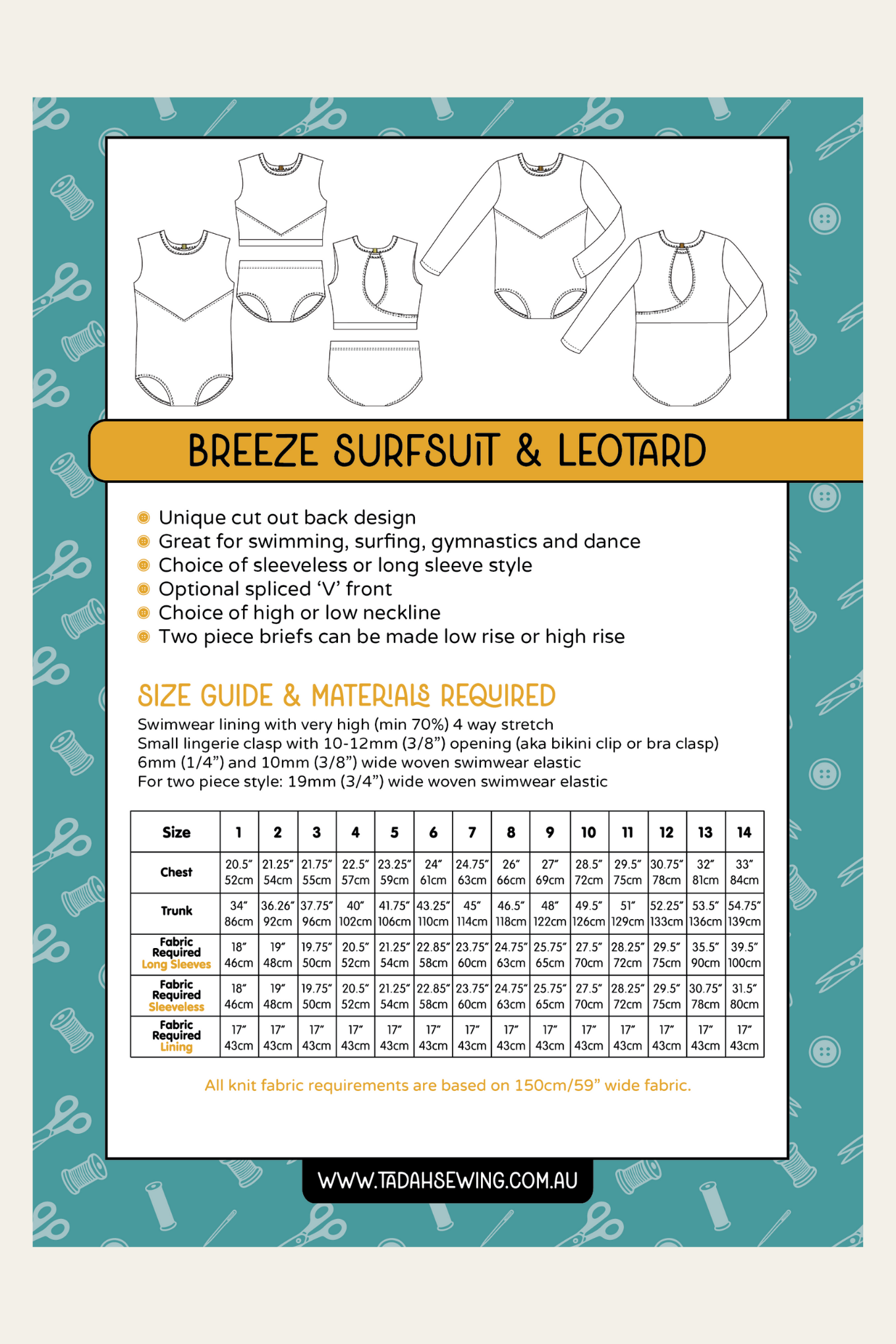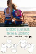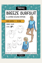 The ultimate must-have option for anyone with an active girl, the Breeze Surfsuit and Leo pattern is best suited to chlorine-resistant spandex fabric for swimwear, or cotton/Lycra for bodysuits and leotards.