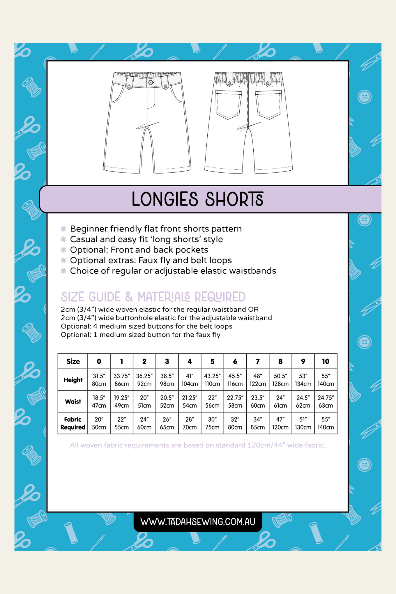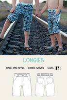 Be creative with your fabric choices - solids, contrasting prints, linen or denim, the possibilities are endless - they even look great in girlie fabrics! This multiple size pattern comes in sizes 6 months to 10 years, colour-coded for ease of cutting. Longies are suitable for advanced beginner sewers and can be made in any light to medium weight woven fabric.