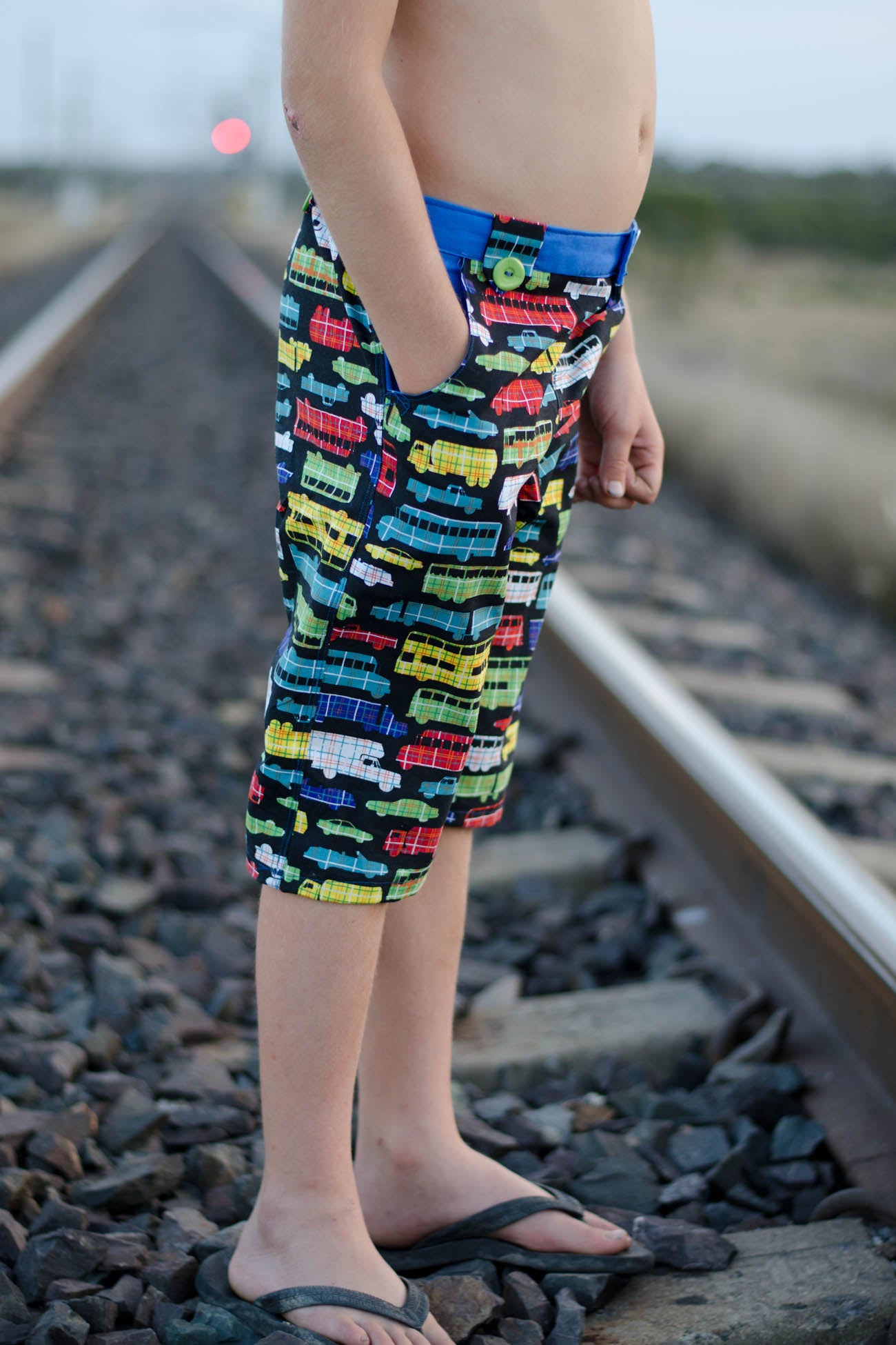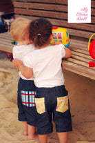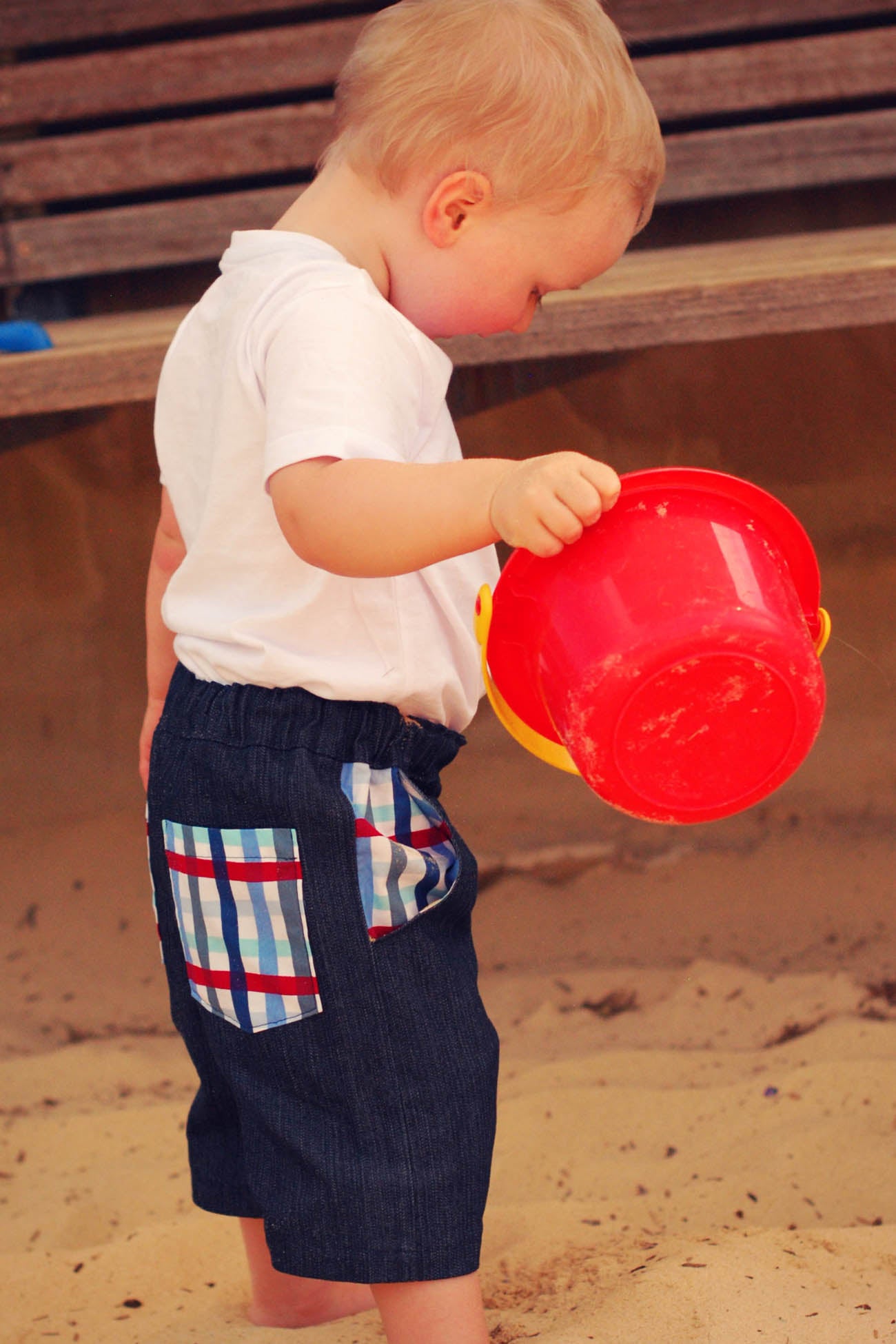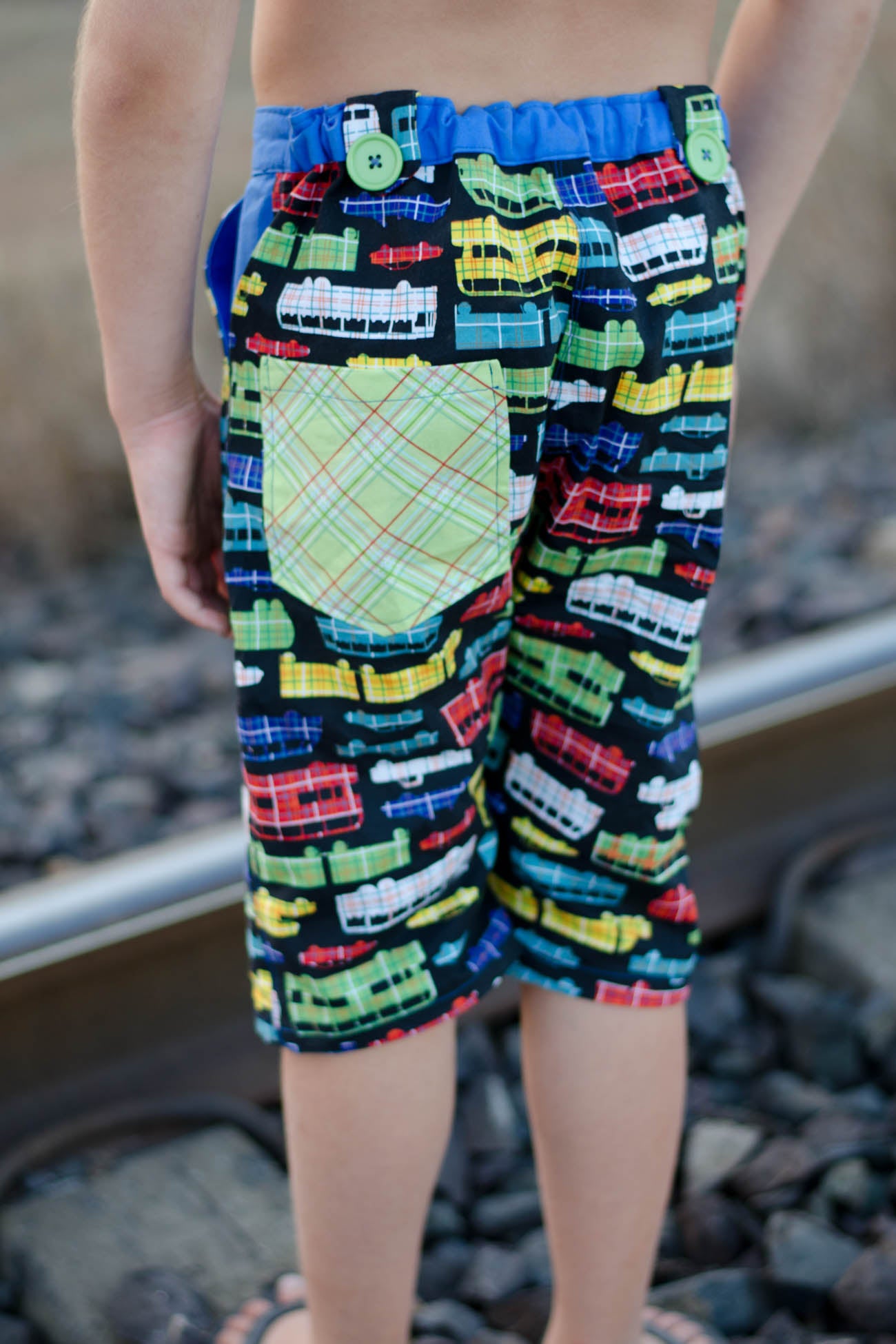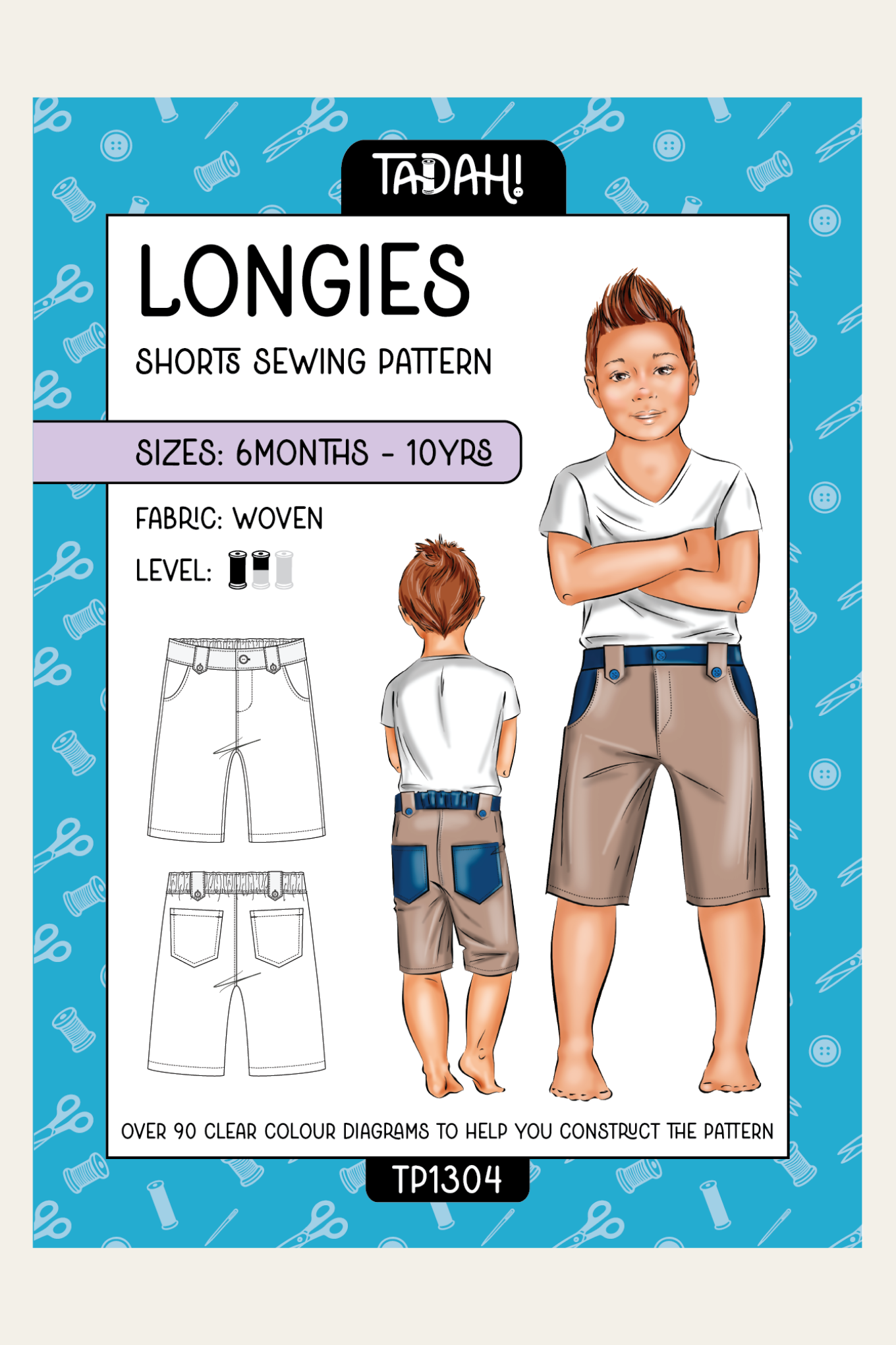 These versatile shorts can be made with back pockets and/or front pockets. The optional faux fly and belt loops will make your little guy feel like one of the big boys. To keep up with growing boys, the waist can be made to be adjustable however the faux fly can also be made with regular elastic, and the pattern also features a simple elastic waist. These stylish long shorts are loose fitting for comfort and fall slightly below the knee. Your boy will love these practical, fun-to-wear Longies. And best of all, they will get many years of wear out of them!
