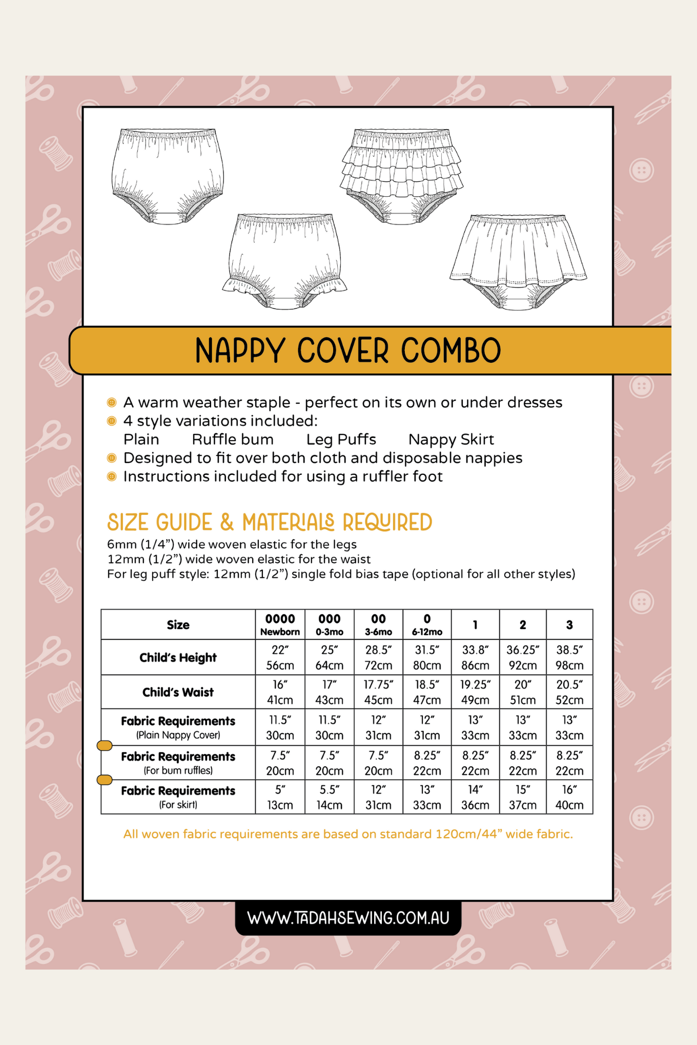 An absolute essential in every little ones wardrobe, Nappy Covers have many more functions than just simply covering an ugly nappy. The Nappy Cover Combo includes pattern pieces and directions for 4 variations: the ruffle bum, nappy skirt, leg puffs and plain.