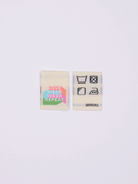 The Love Wear Wash Repeat label has a series of washing care symbols on the reverse side: gentle machine wash, do not tumble dry, dry in the shade + warm iron.