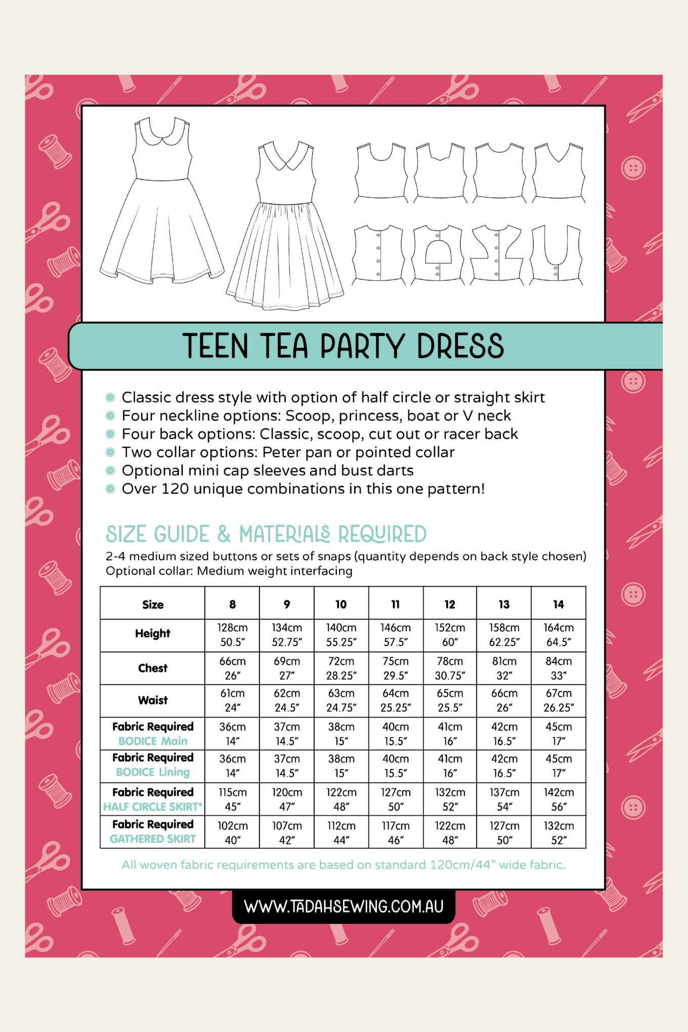 With over 190 UNIQUE combinations possible in this pattern, the Tea Party Dress will quickly become you go-to dress pattern!