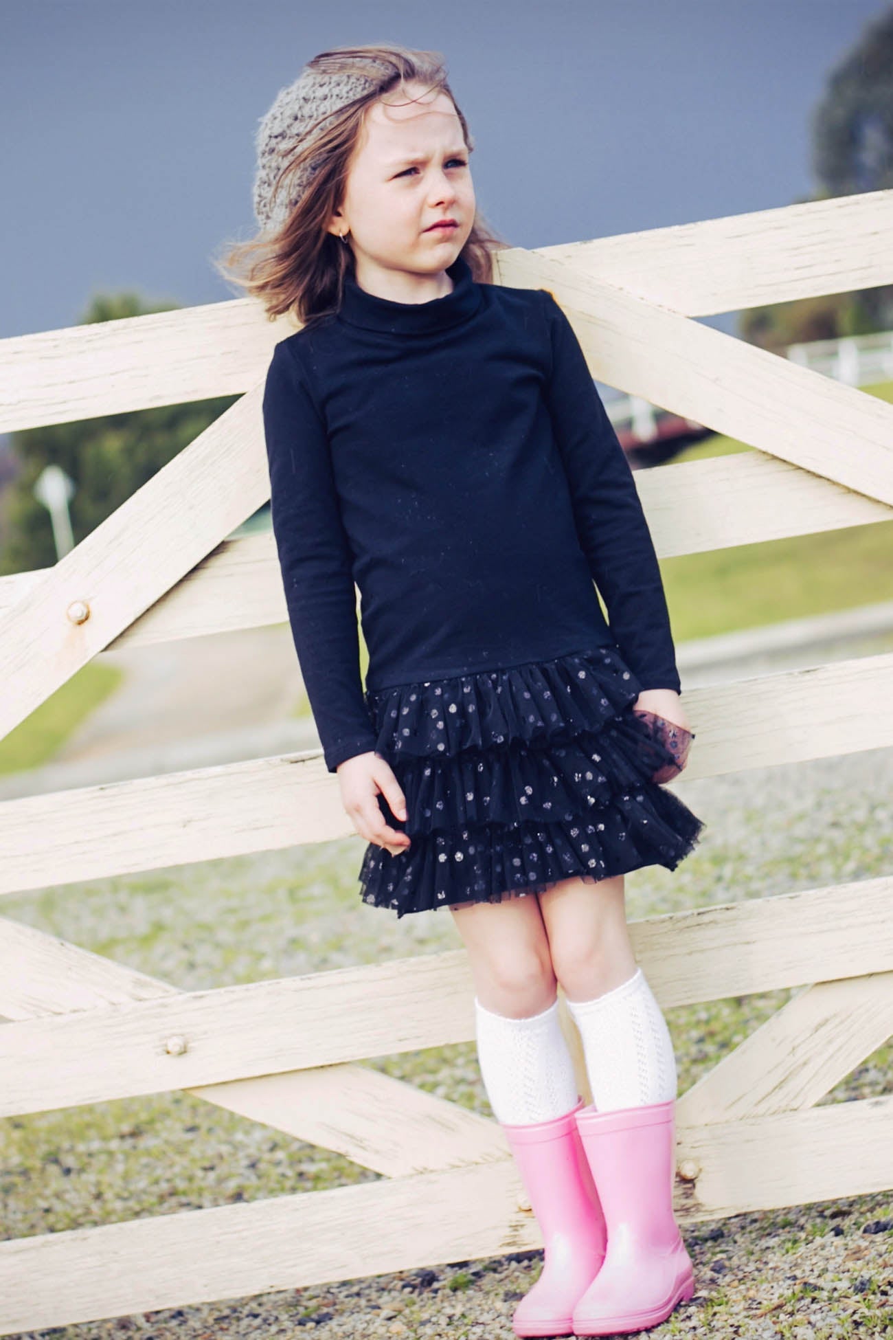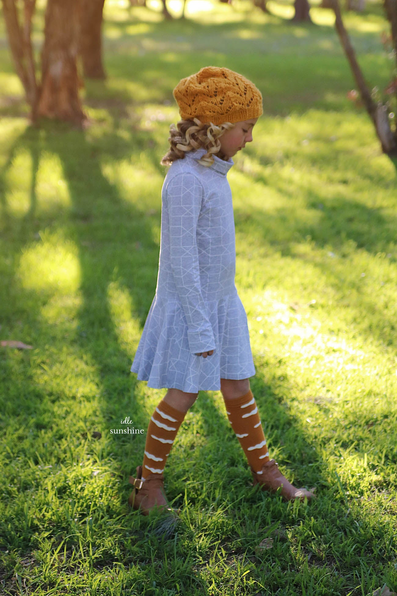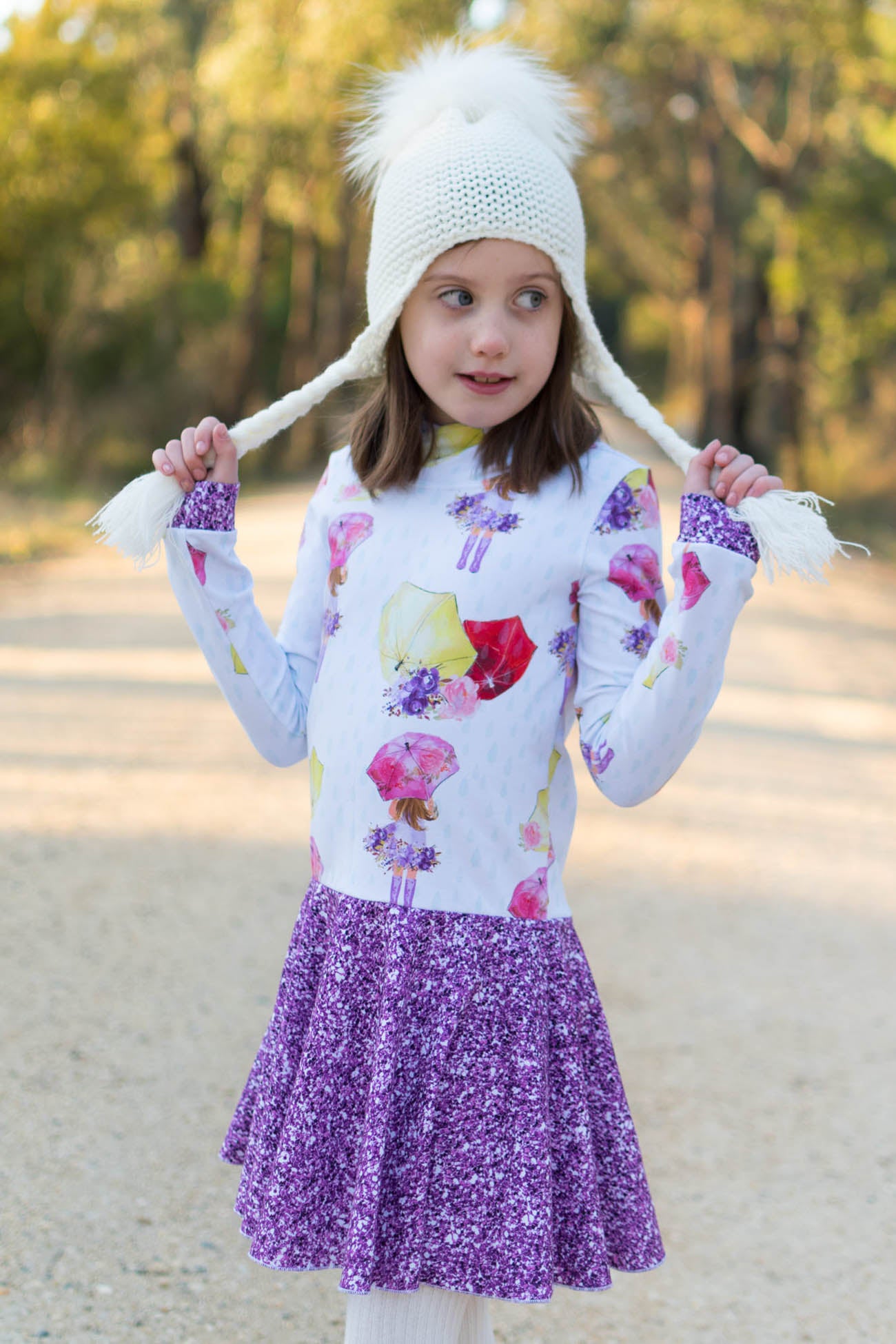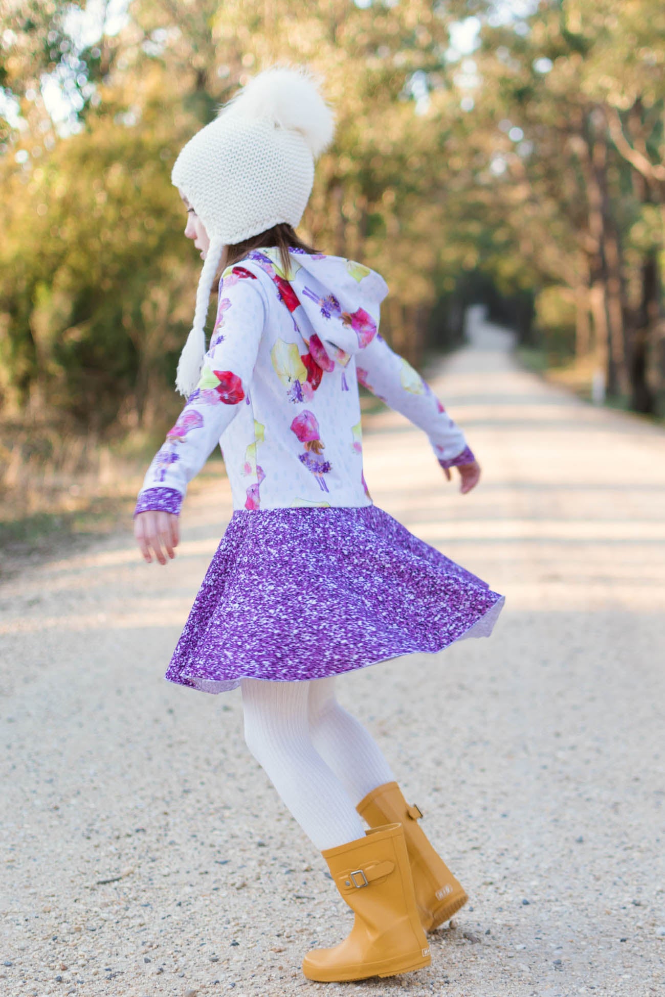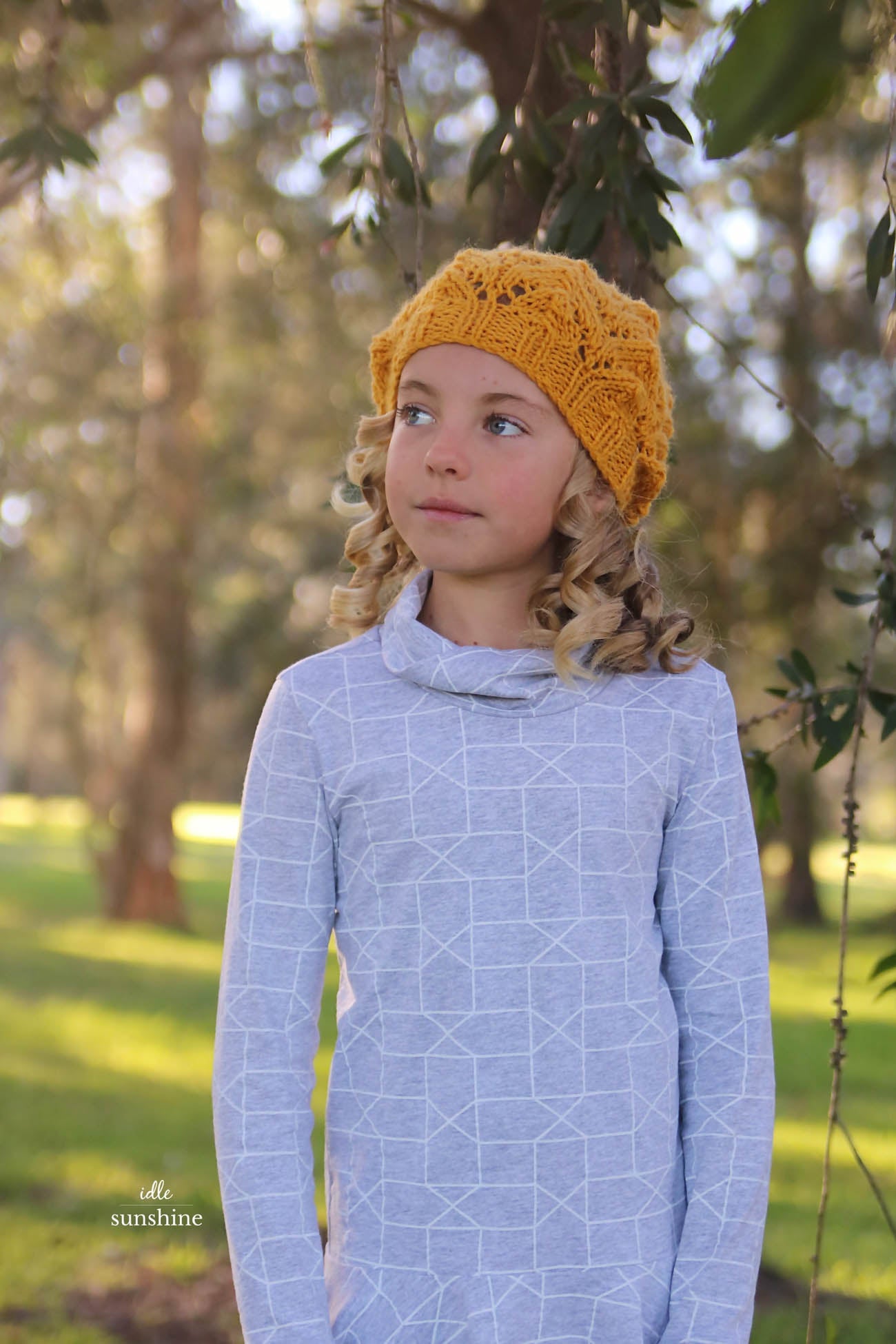 From the top down, this is a pattern with ultimate versatility. The neckline options include a band, binding, turtle neck or hood. The skirt can be as simple as a gathered number, as full as a circle or as fabulous and floaty as tri-level tulle. For sleeves, the selection extends to flounce, short gathered, short straight, mid or long, and to really ward off the winter chill, there’s the option of extended cuff complete with thumb holes.