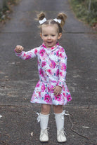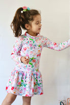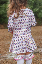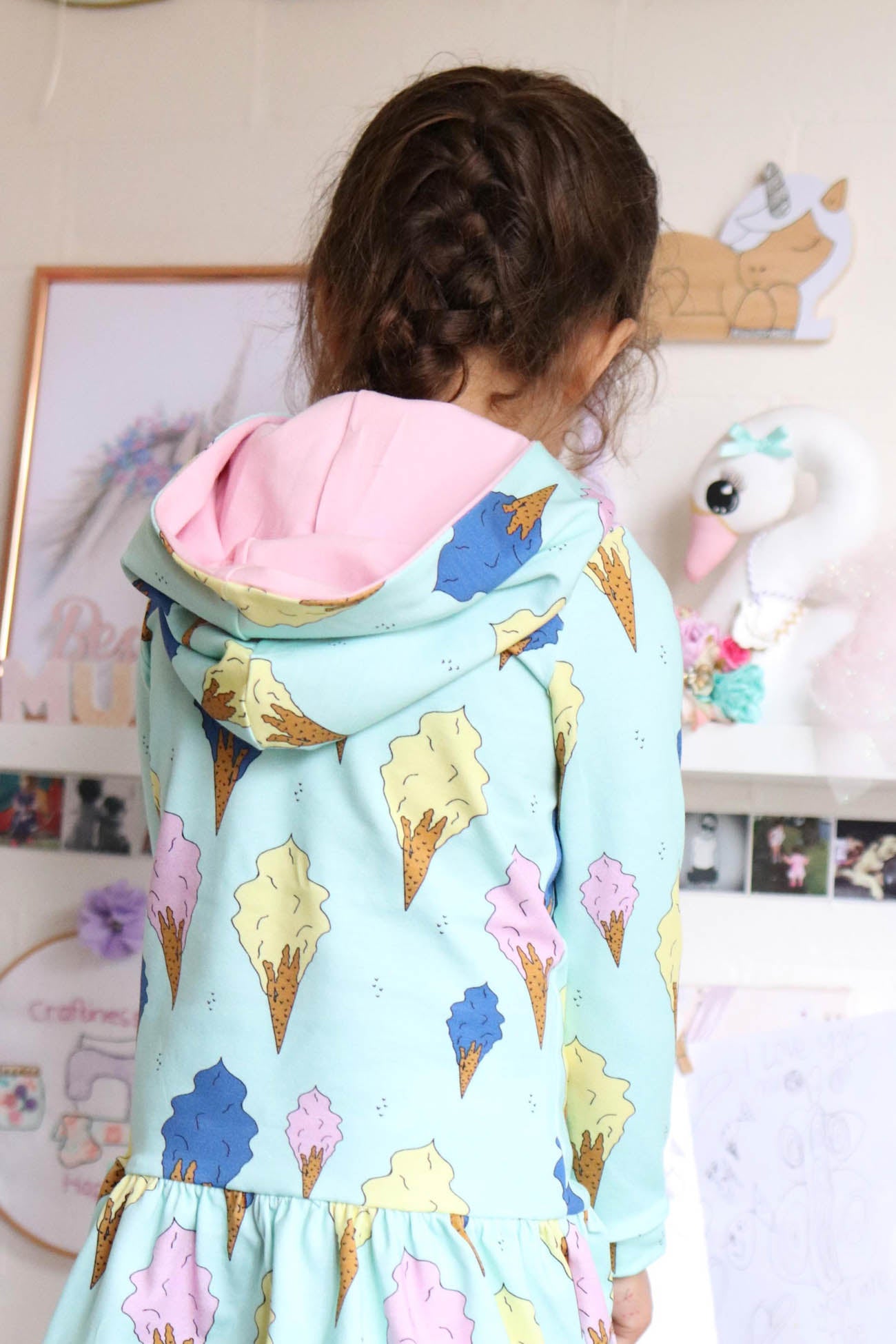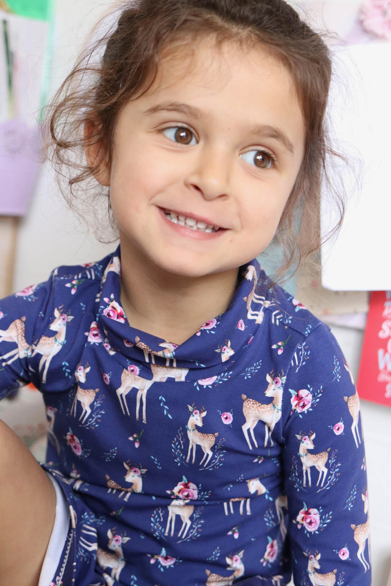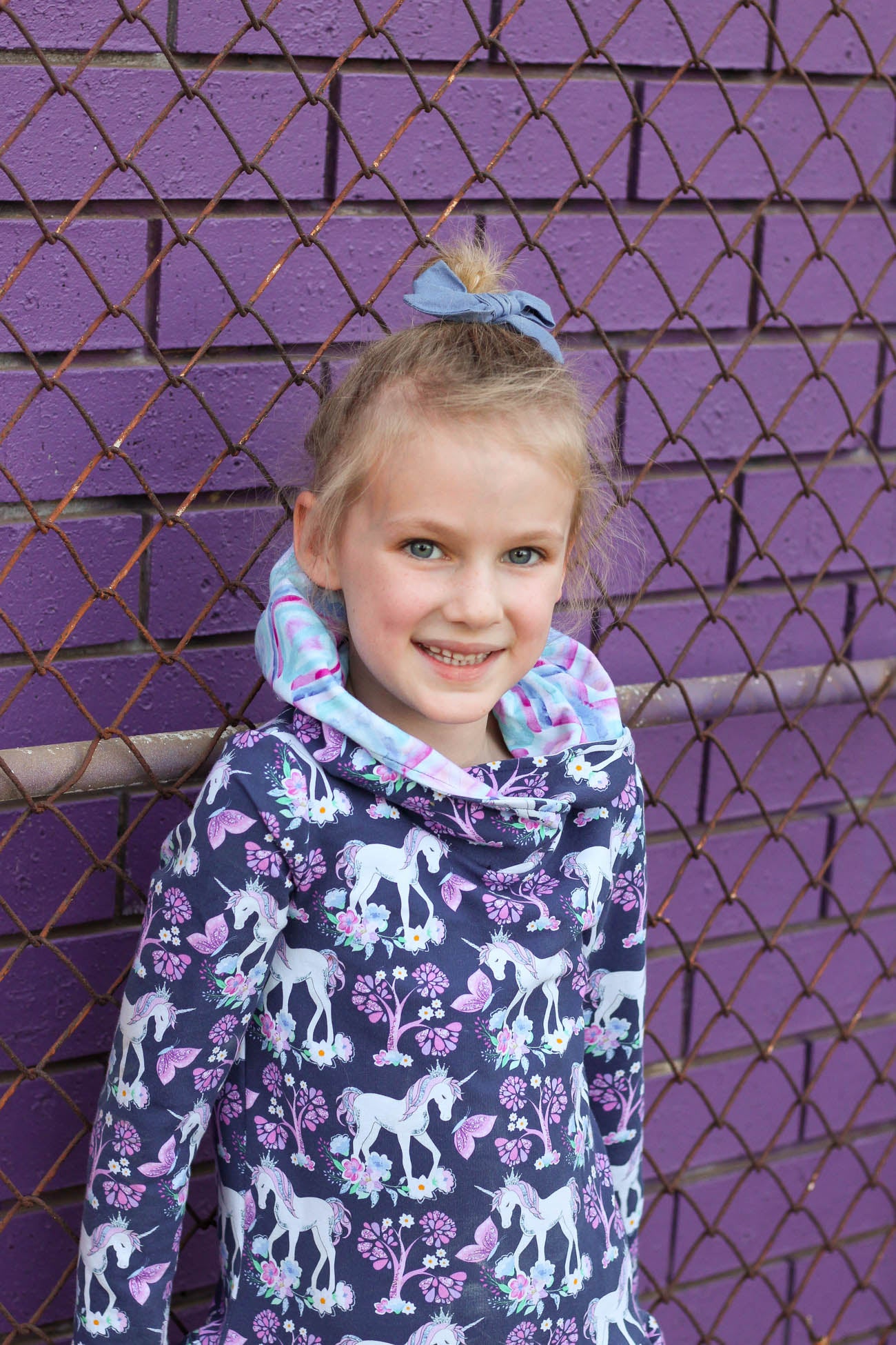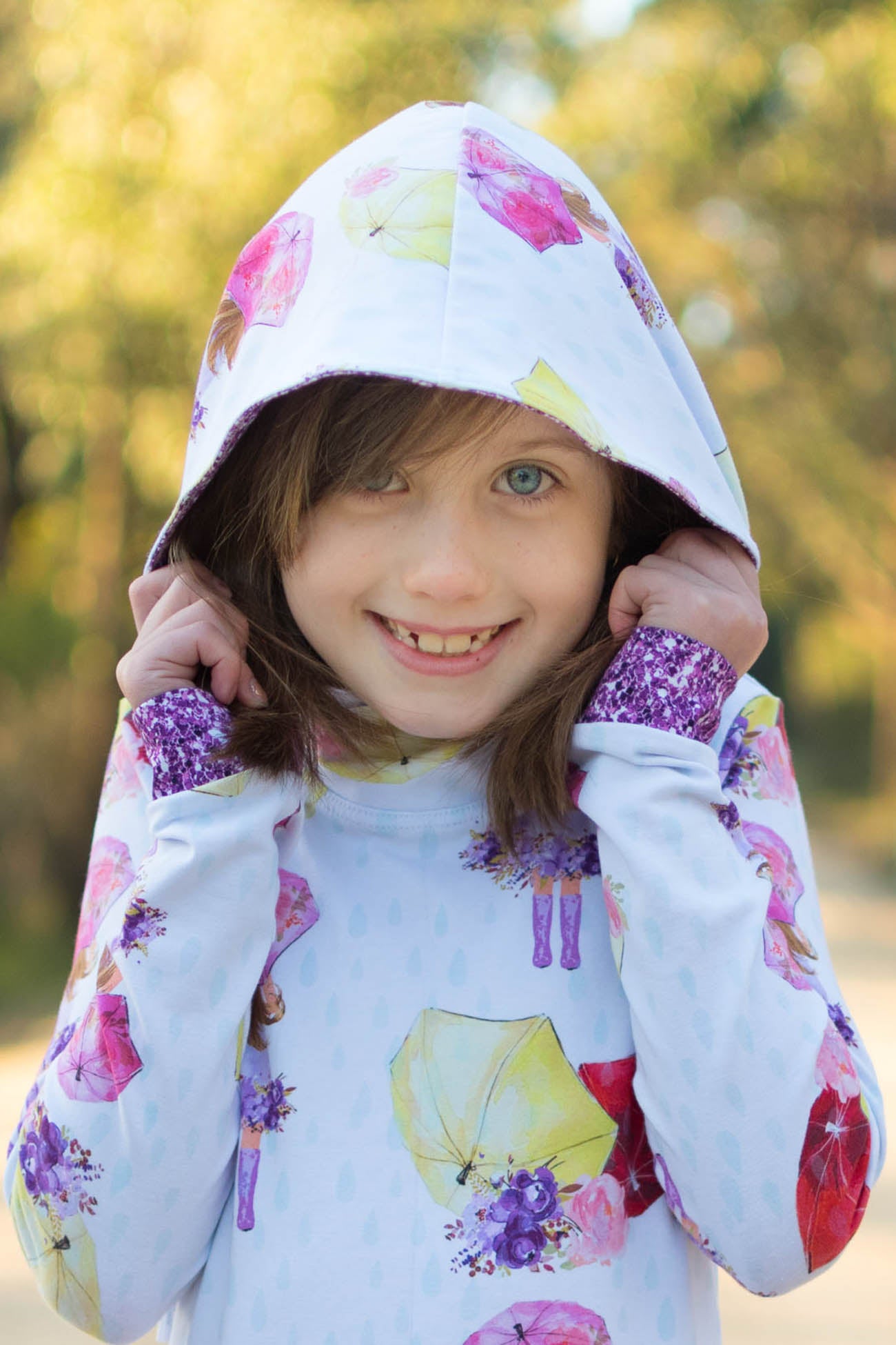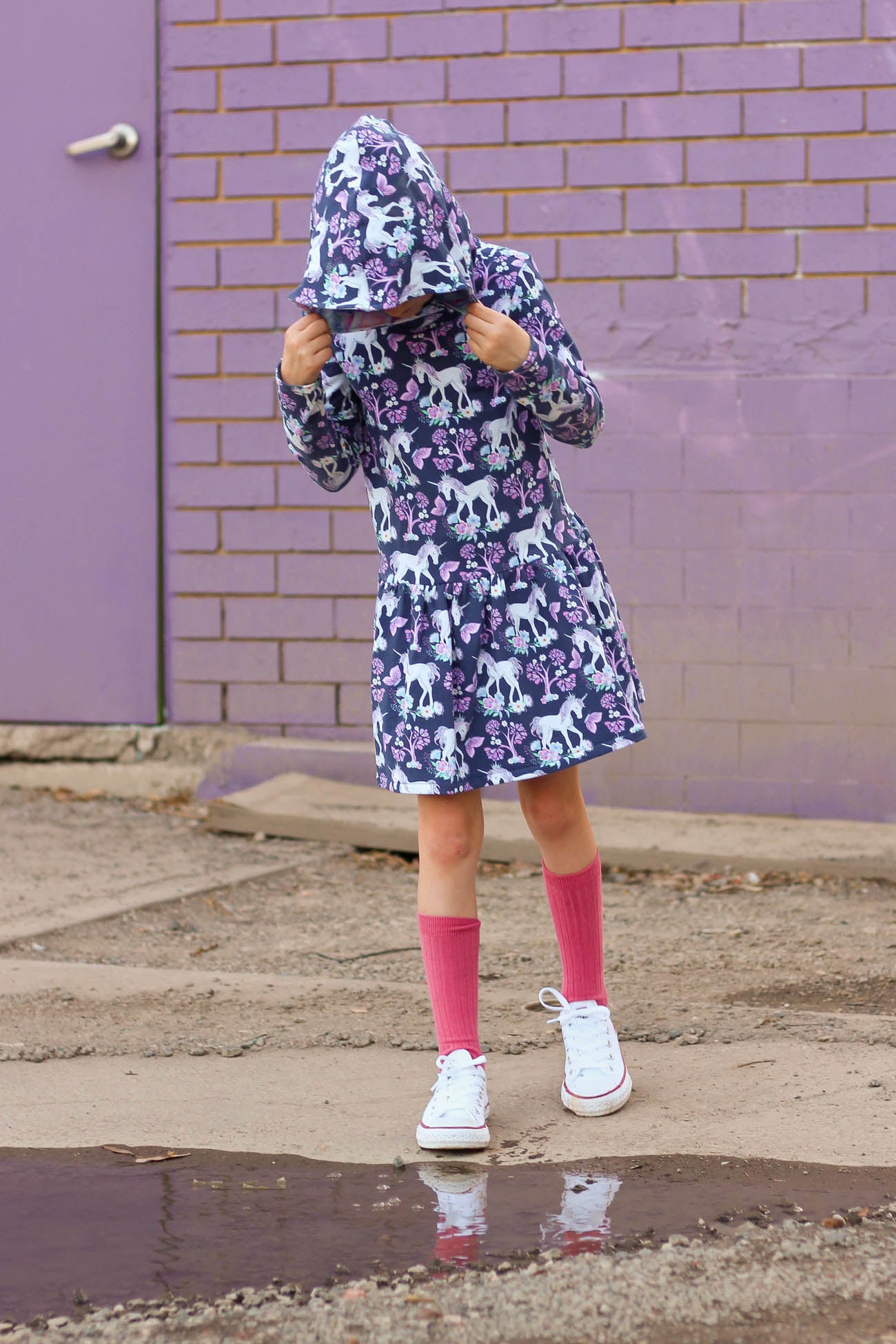 From the top down, this is a pattern with ultimate versatility. The neckline options include a band, binding, turtle neck or hood. The skirt can be as simple as a gathered number, as full as a circle or as fabulous and floaty as tri-level tulle. For sleeves, the selection extends to flounce, short gathered, short straight, mid or long, and to really ward off the winter chill, there’s the option of extended cuff complete with thumb holes.
