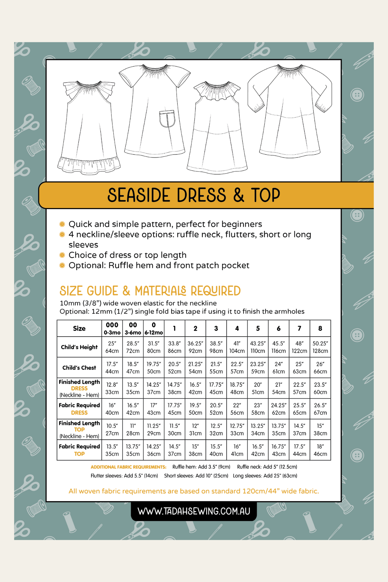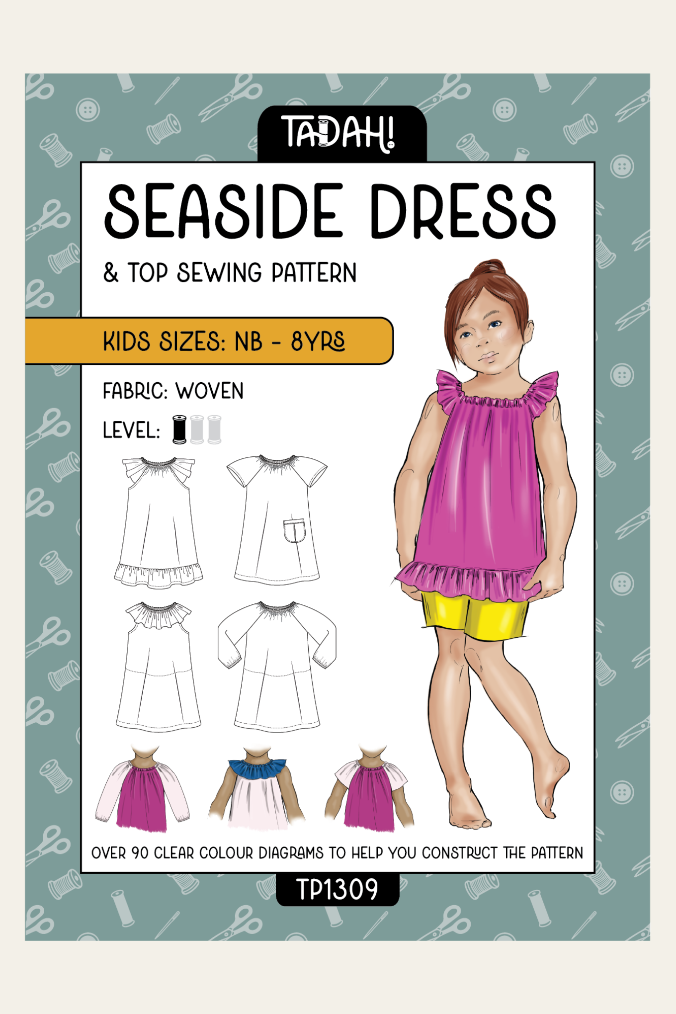 This Seaside Dress and Top pattern offers classy, fresh style for your charming princess. This easy to sew little dress can be made with a ruffle neck, flutter sleeves, short sleeves or long sleeves. The four top versions feature the same necklines as the dress and are a cinch to sew; you’ll want to make several! You can also make the Seaside Dress with a sweet little pleated pocket for your little miss to store all her treasures. The hem of the dress/top can also be made with ruffles for even more added cuteness! This multiple-size pattern fits girls from size 000 (0-3months) to 8 and features colour-coding for ease of cutting. It is suitable for beginner sewers and can be made in any light to medium weight woven fabrics - cotton, seersucker, lightweight denim or linen.