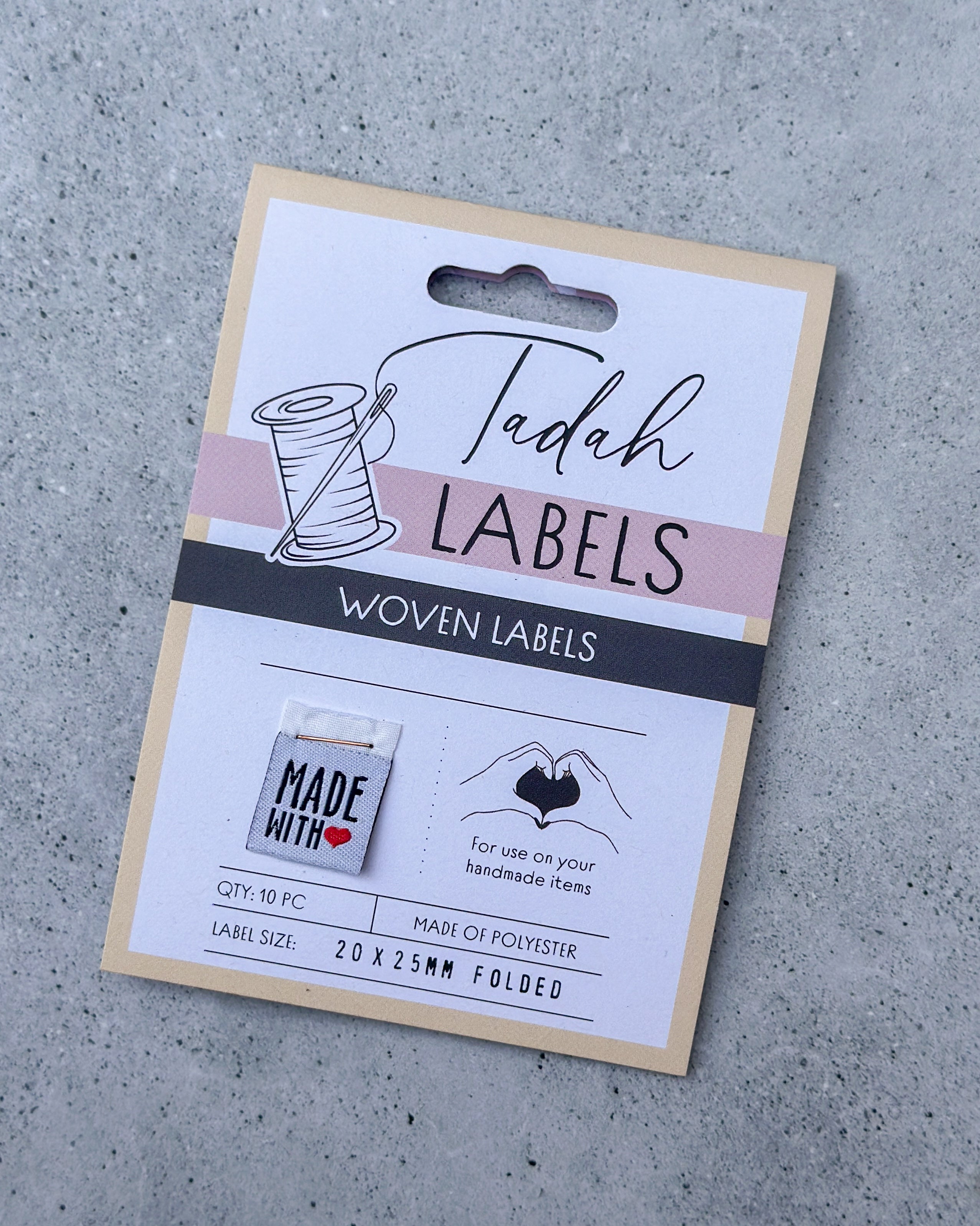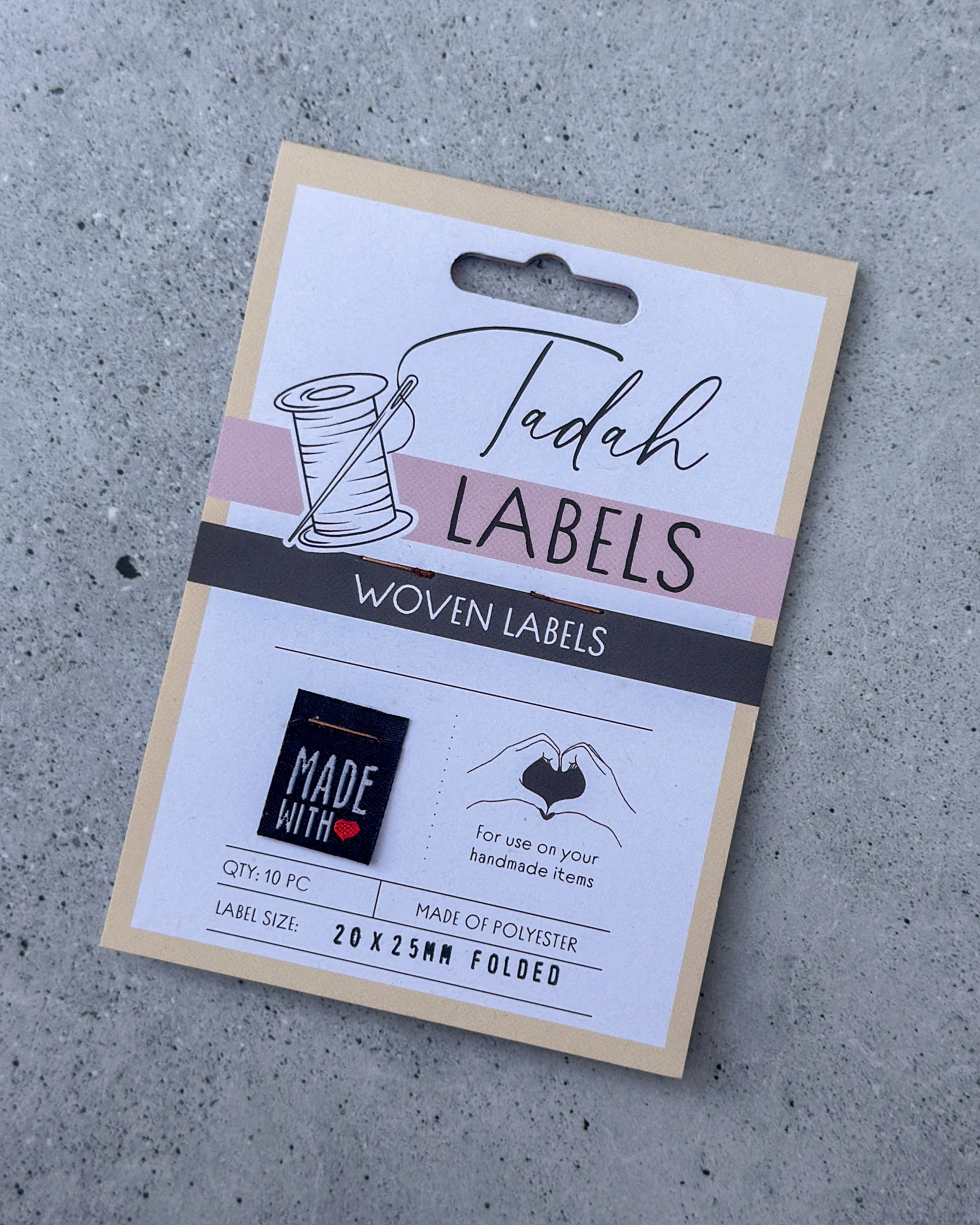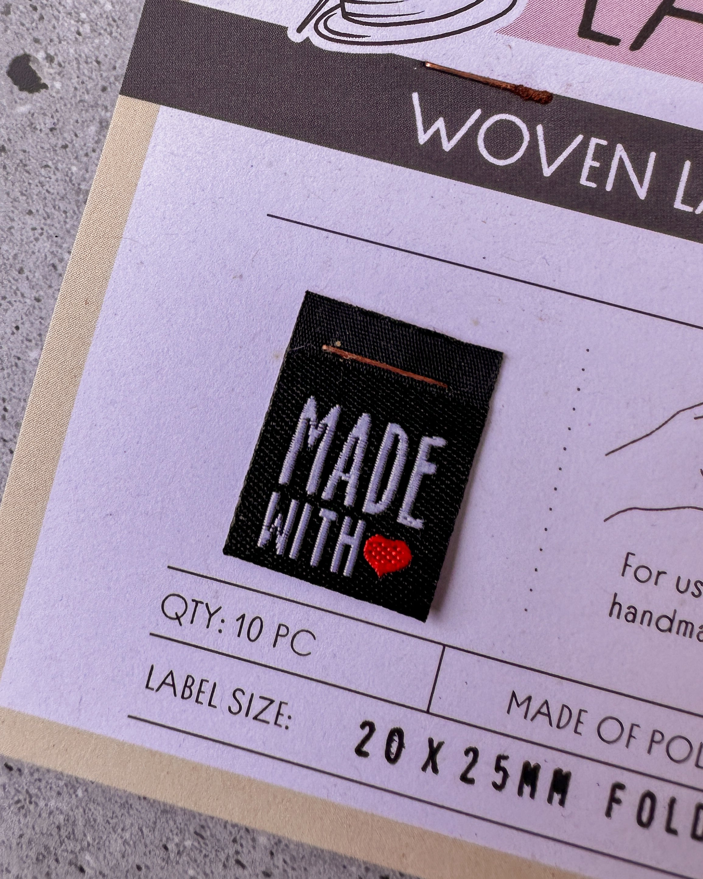 'Made with Heart' Basic Woven Label Pack - 10pc - Black on Grey