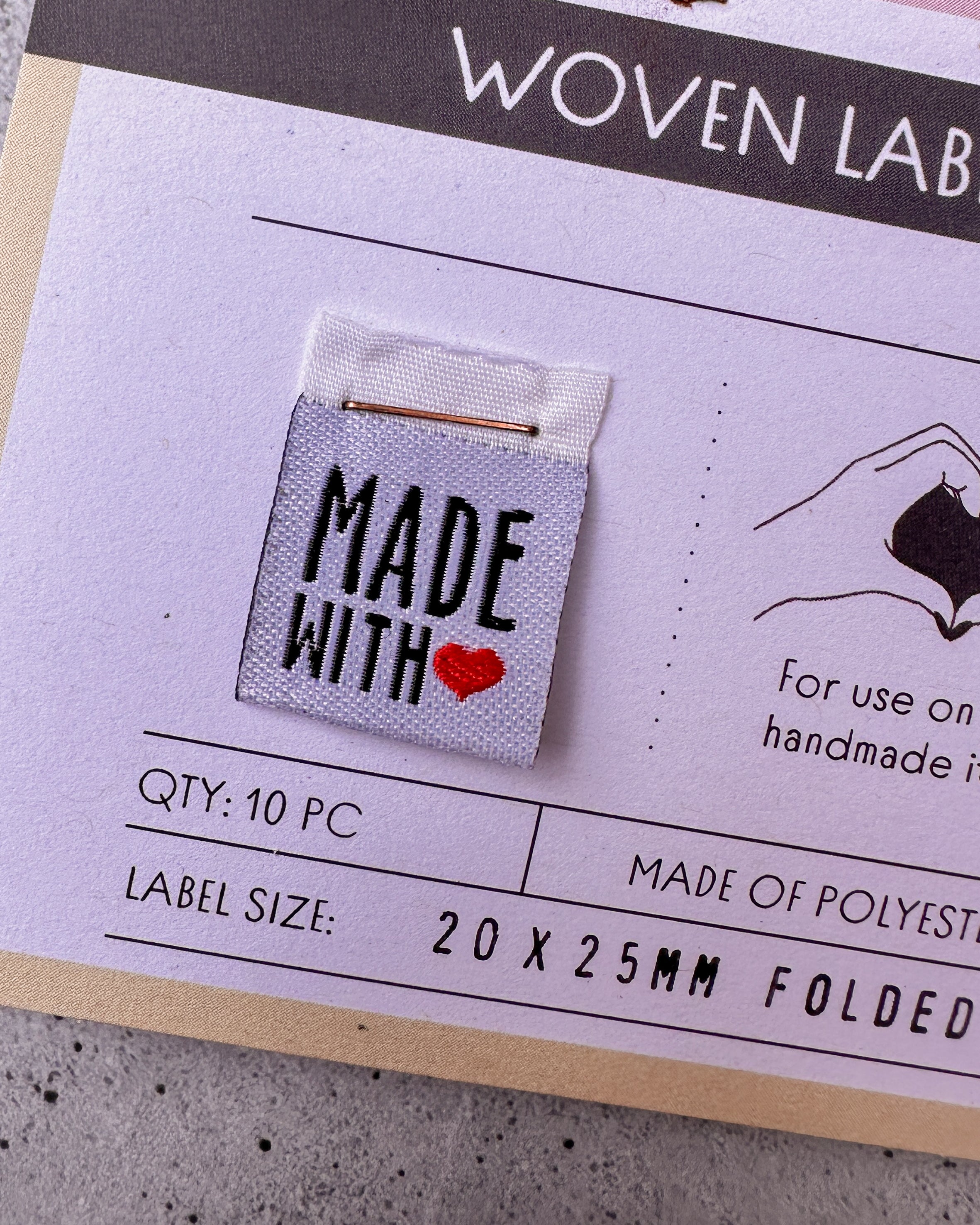 'Made with Heart' Basic Woven Label Pack - 10pc - Black on Grey