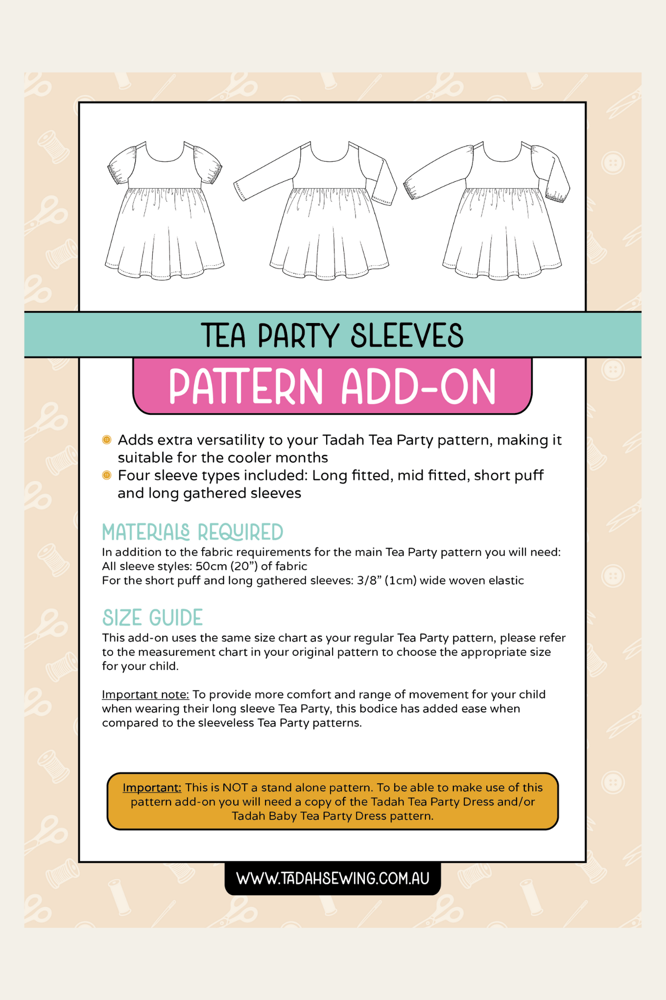 A versatile little add-on to help you create Tea Party outfits suitable for wearing in the cooler months (or for extra sun safety in the summer!). This pattern includes 4 different sleeve types - long fitted sleeve, mid fitted sleeve, short puff sleeve and long gathered sleeve.