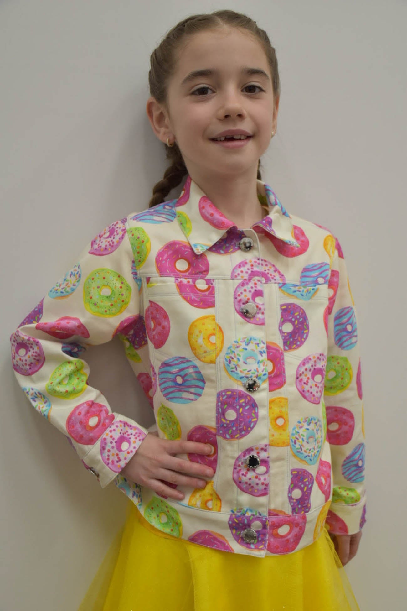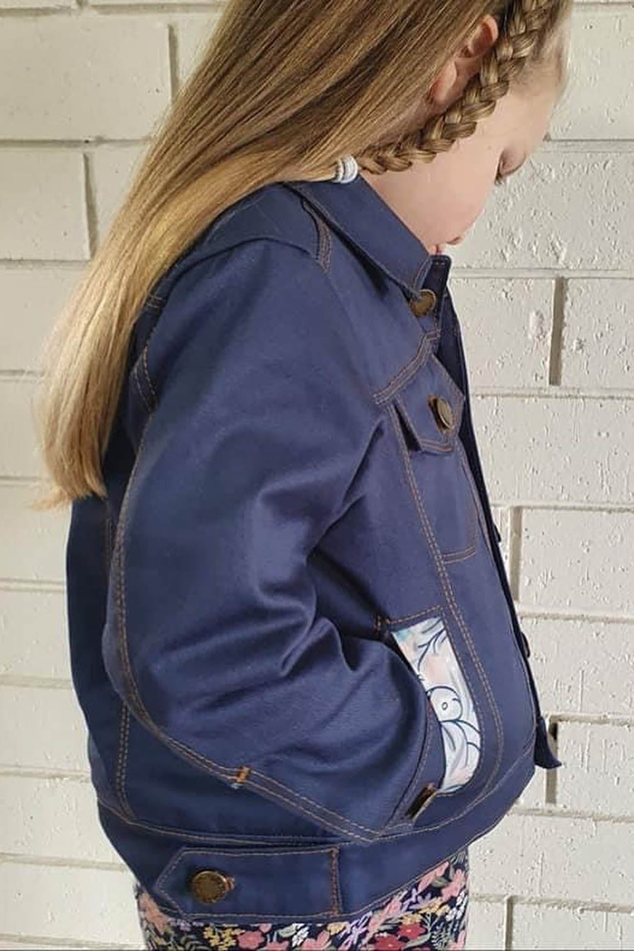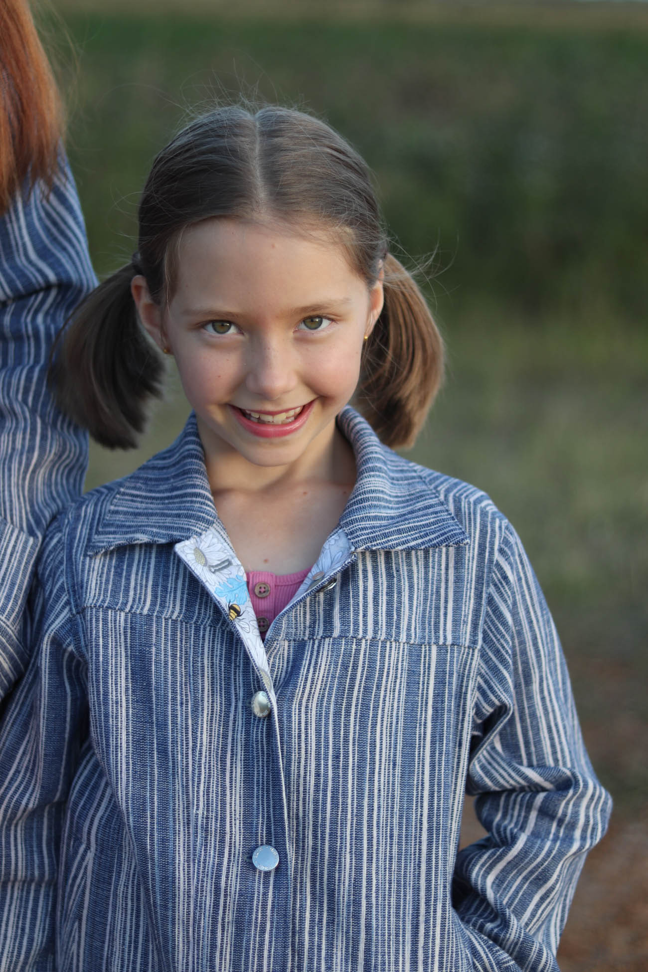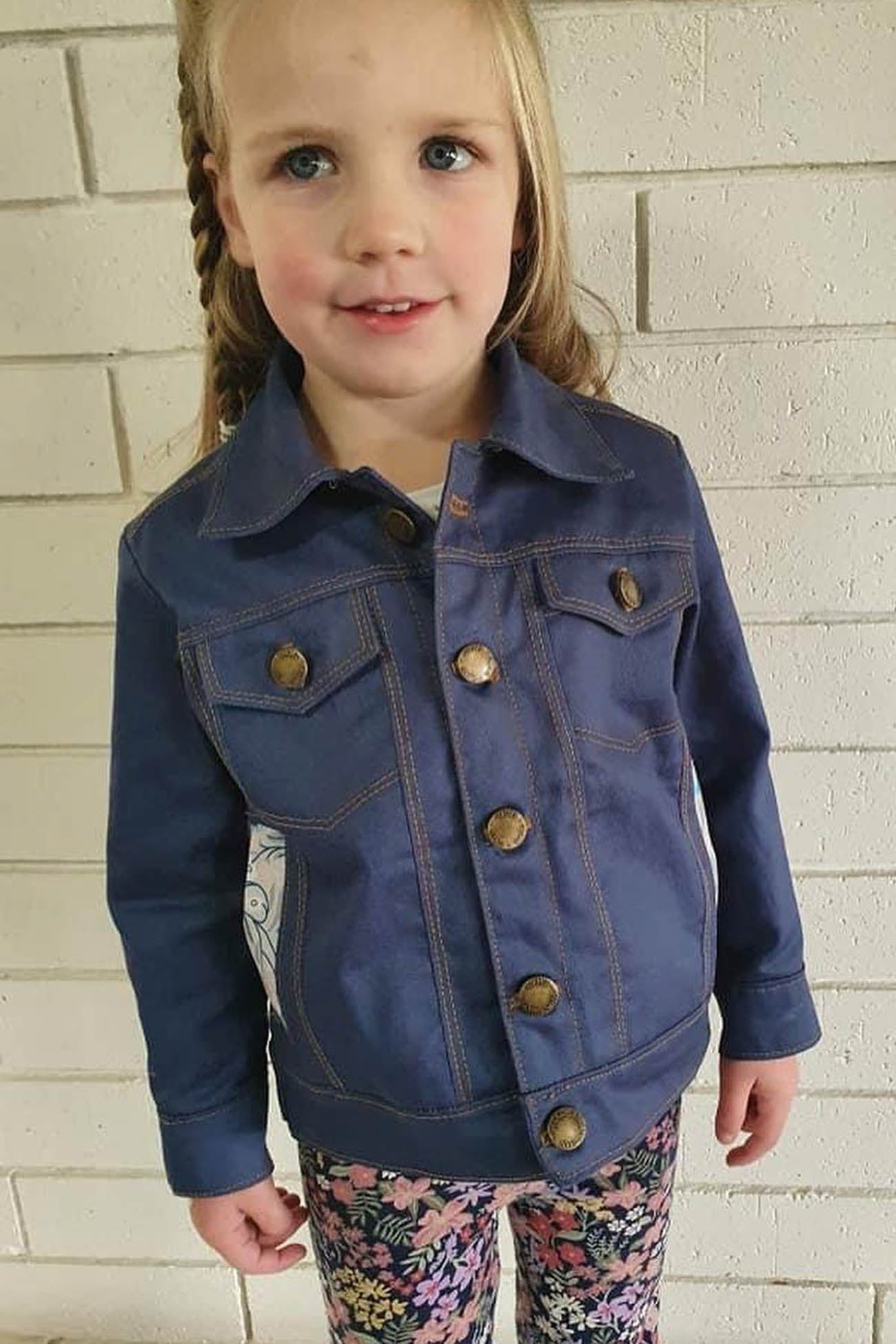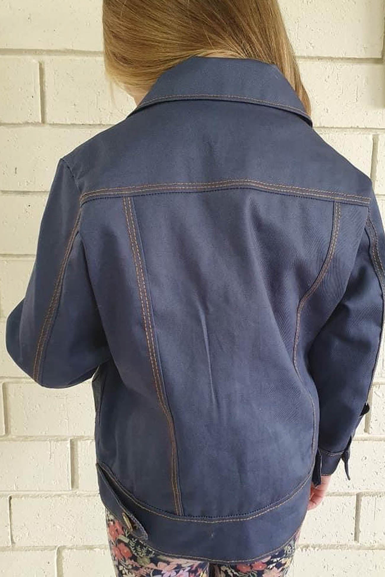 The Street Jacket is available in three pattern sizes of Baby (0000-2), Kids (3-8), and Teens (8-14), and is suited medium to heavy weight fabrics including denim, corduroy, suiting, linen, drill and twill.