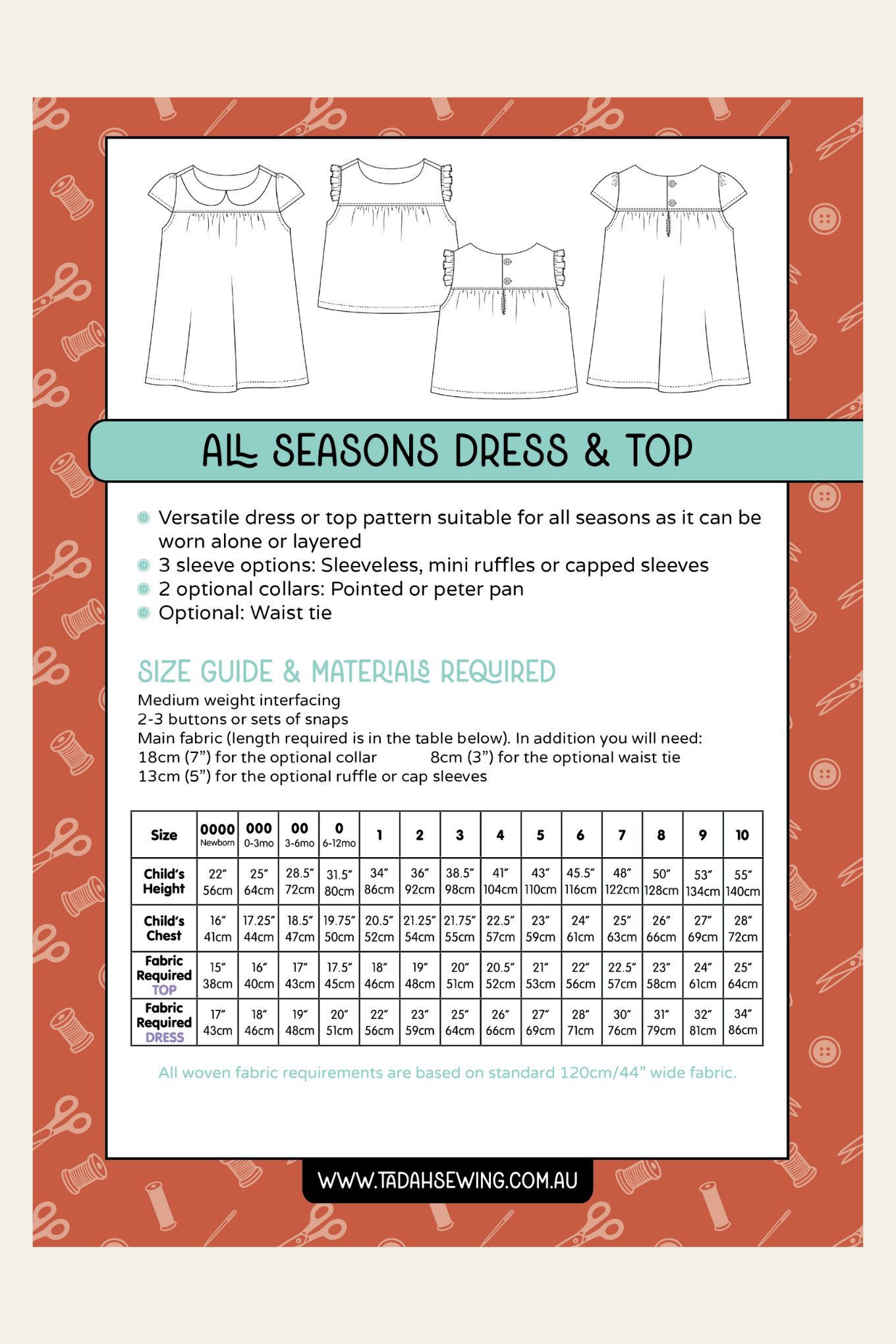 The All Seasons dress pattern has been specially designed to be a ‘sister pattern’ to the Vintie Overalls pattern. You can mix and match the All Seasons bodice with the Vintie’s romper bottom, or the Vintie yoke and strap with the All Seasons dress piece. Giving both patterns even more options! Check out the Vintie Overalls pattern HERE or purchase them both as a bundle HERE.