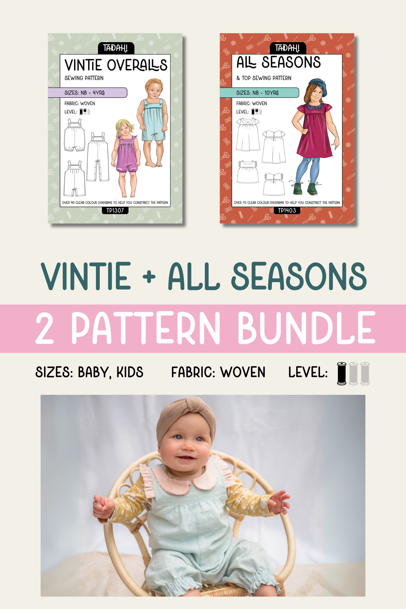 - Use the yoke (and collars/ruffle sleeves) of the All Seasons pattern with the romper pieces of the Vintie Overalls to create an All Seasons Romper