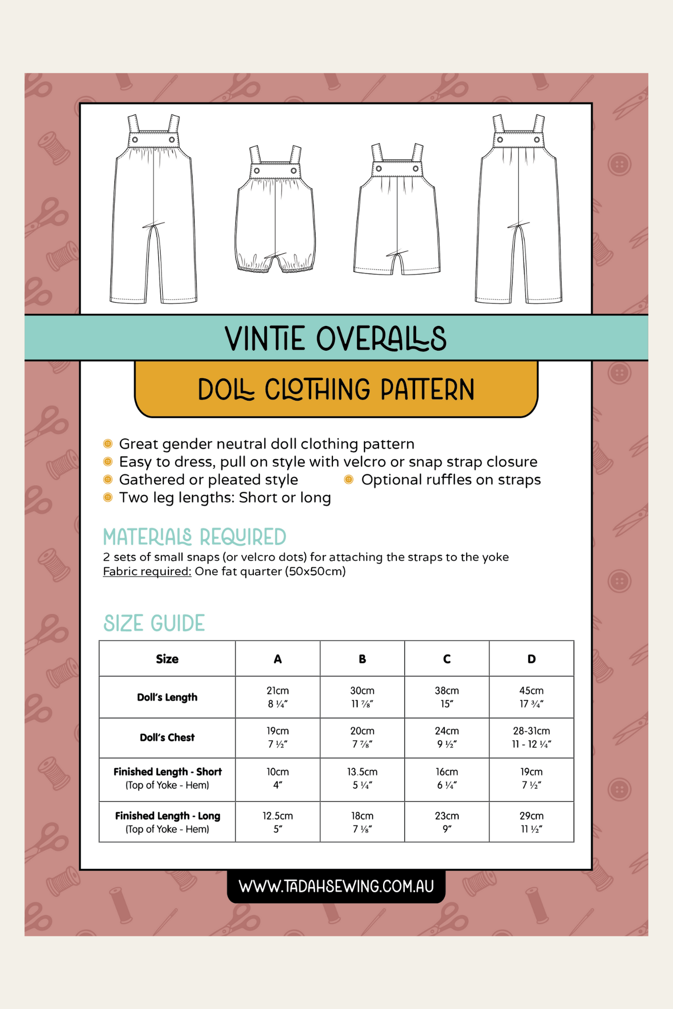 If you have any trouble printing or assembling your pattern please contact us via email and we will do our best to troubleshoot with you to find a solution –help@tadahpatterns.com.au