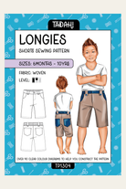 Be creative with your fabric choices - solids, contrasting prints, linen or denim, the possibilities are endless - they even look great in girlie fabrics! This multiple size pattern comes in sizes 6 months to 10 years, colour-coded for ease of cutting. Longies are suitable for advanced beginner sewers and can be made in any light to medium weight woven fabric.