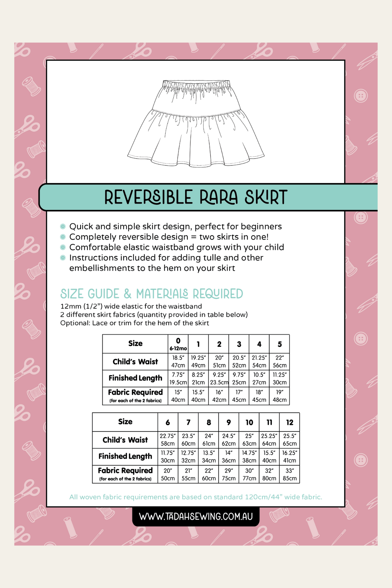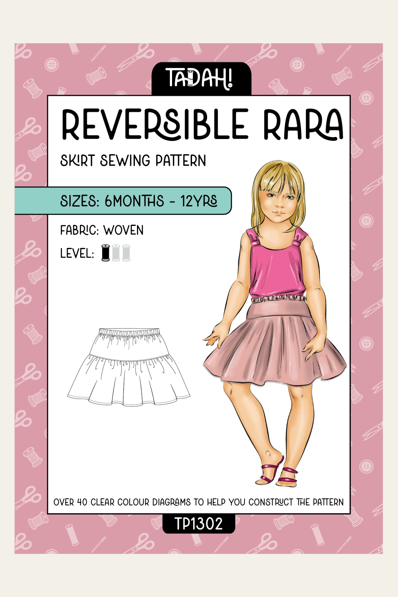 Girly and versatile, the Reversible RaRa Skirt sports a lovely wide flounce your little one will love to dance and twirl around in. It features a completely smooth, professional look with no exposed seams, yet it is easy for beginning sewers to make. The elastic waist is simple to construct and makes for easy fitting. Several options for finishing the hemline are included - straight hem, lace, ribbon, ric rac, pom poms or tulle! Best of all, you and your child will love the fact that it can be worn two different ways - it can be worn with either side facing out. Make the two sides in complementary colours or in entirely contrasting colours. It’s your choice! This multiple-sized pattern includes sizes 0(6 months) - 12. It is suitable for the sewing skills of beginners and can be made in light to medium weight woven fabrics—cotton, seersucker, lightweight denim, linen.